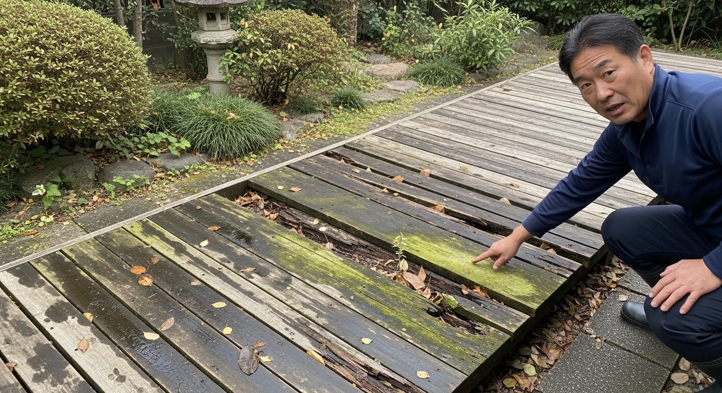 名古屋の夏は気温が高く、梅雨の時期には雨が続くため、湿気が逃げにくい環境が長期間続きます。この状態がウッドデッキに与えるダメージは、外から見えないうちに蓄積されていきます。「まだきれいに見える」という段階でも、内部や裏面では劣化が進んでいることがあります。見た目の判断だけでなく、定期的な点検を習慣にすることが大切です。