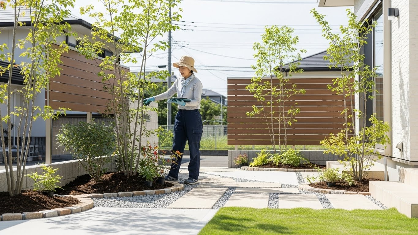 水やりや剪定の手間を抑えたい場合、常緑樹の本数を絞りつつ、丈夫で病害虫に強い樹種やグランドカバーを組み合わせるのが有効です。