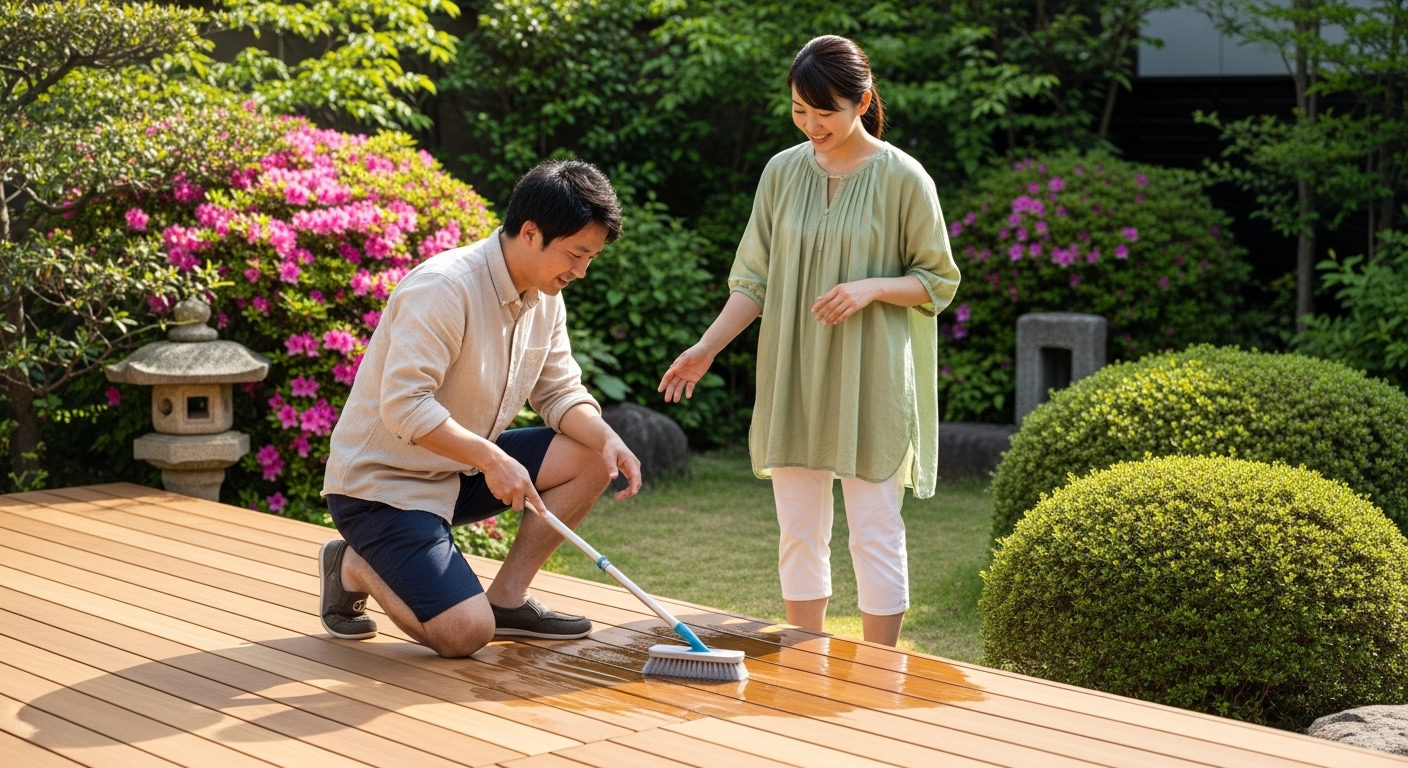 A8. デッキ単体ではなく、庭全体の汚れルートを見ることです。庭の土の露出、落ち葉の発生源、雨水の流れを全体として把握することで、効果的な予防策が見えてきます。