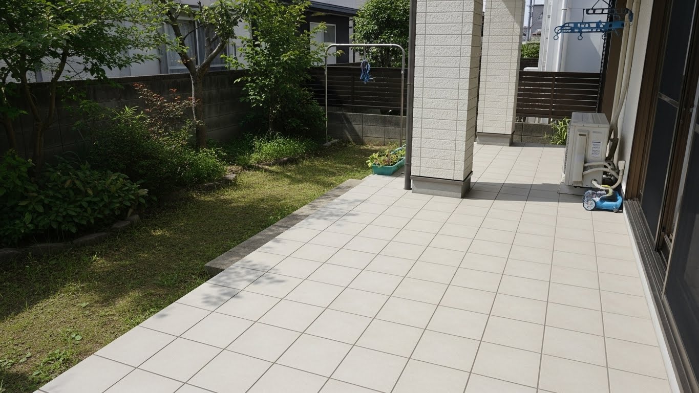結論として、名古屋特有の「暑くて雨も多い」気候には、タイルテラスの耐久性がよく合います。タイルは雨や直射日光による変色・腐食が起こりにくく、数十年単位で美観を保ちやすい素材です。