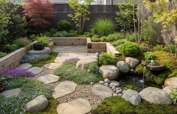 - 和モダン庭園 🎋 石組みと水景をスポットライトで浮かび上がらせ、窓越しに四季の表情を楽しめる「眺める庭」として計画した例。